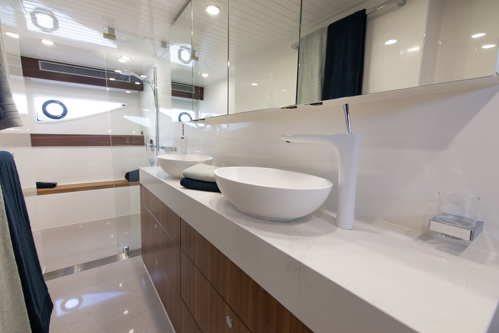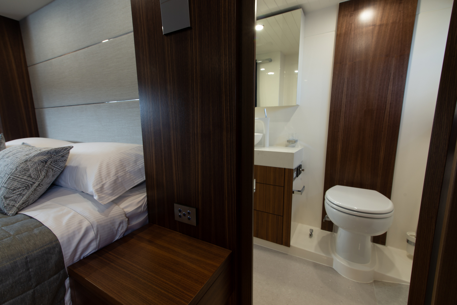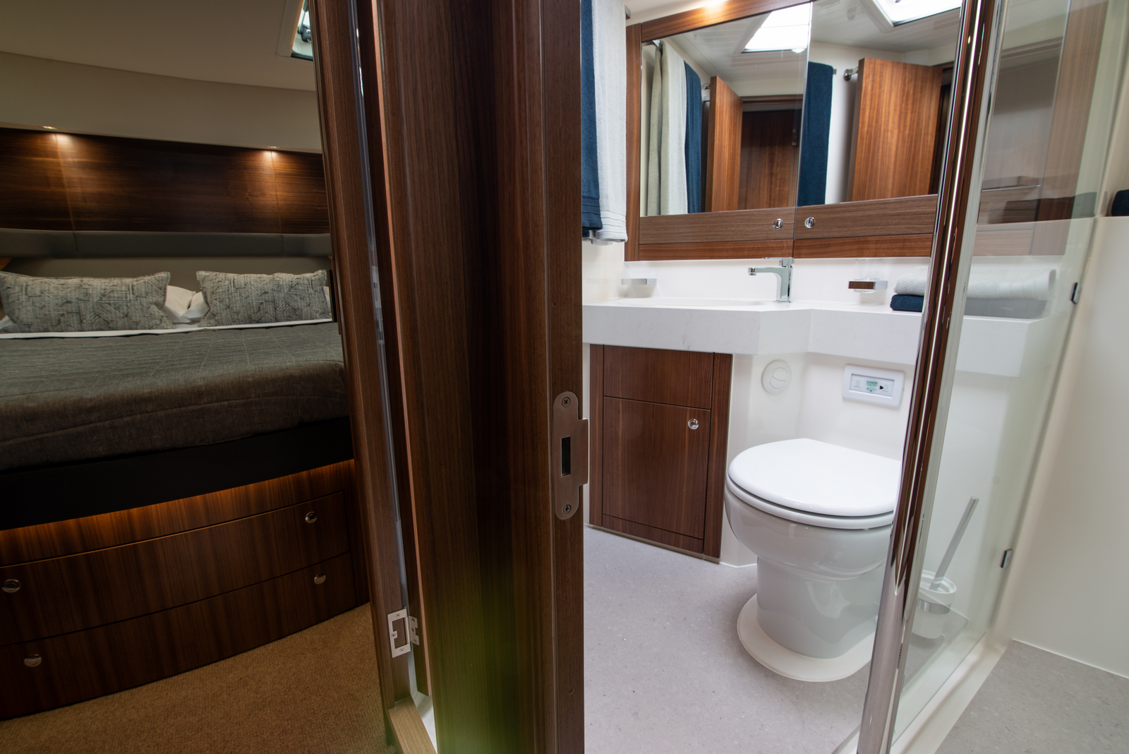 Behind the bulkhead of the master is a full-beam bathroom, with dual sinks and custom mixers that look like they could dispense a liquid tastier than water. Above and below the vanity has more impressive storage catering to extended periods onboard. The shower cubicle is of ample height and width with a remarkable volume with wide teak finished seat. The position of the bathroom also allows for an additional bulkhead and buffer zone from the engine room aft.