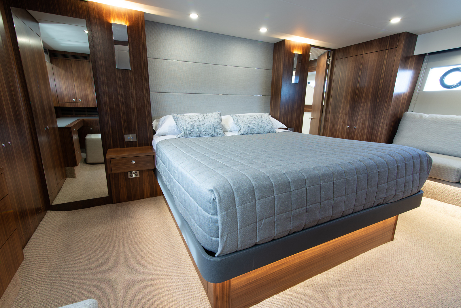 Centrally located with the maximum beam of the boat is a place you can find solace in the practical layout of the master cabin. Immediately to starboard is the enormous desk/vanity area. It’s L-Shaped which expands the storage options enabling a duality to function as an office or as a dressing table. Storage is a noteworthy feature of this cabin, port and starboard double door wardrobes span the full cabin height enabling an extensive clothes collection to accommodated for everyday life aboard and swanky dinners ashore. The same textured fabric found on the saloon starboard lounge appears again on the plush lounge to port in this cabin.